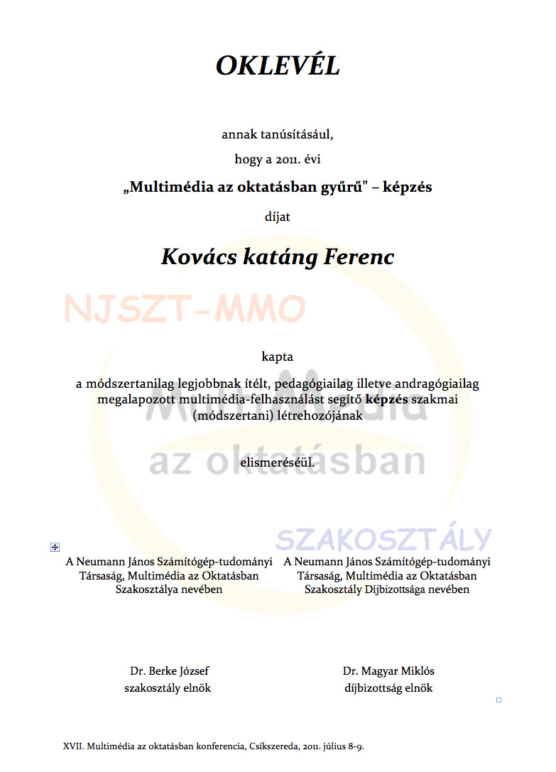 2011. évi „Multimédia az oktatásban gyűrű - képzés díj" díjazottja: