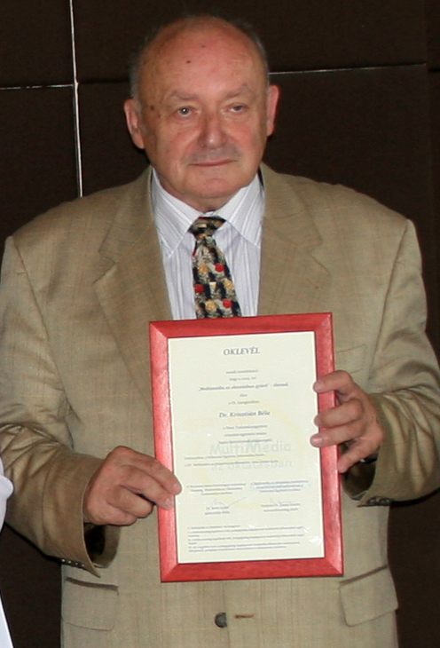 A „Multimédia az oktatásban” gyűrű - életmű díját 2009-ben a NJSZT MMO Szakosztálya Dr. Krisztián Béla címzetes egyetemi tanárnak ítélte, a technológiai alapú tudásközvetítés szakmailag megalapozott felfogásának, az öt taneszköz „nemzedék” eredményes alkalmazási módszereinek, a tudástranszfer andragógiai, pedagógiai szemléletének népszerűsítése és elismertetése érdekében kifejtett tevékenysége elismeréséül. Tanuló felnőtt és fiatal felnőtt nemzedékek szeretett és rajongással emlegetett oktatója, tanítója "a TANÁR ÚR". Egyetemi, főiskolai hallgatók, tanárok, művelődésszervezők, személyügyi szervezők, humánszervezők és kutatók sokasága nőtt fel Dr. Krisztián Béla előadásain, kurzusain, továbbképzésein, publikációin, gyakorlat-orientált módszertani útmutatásain. Emberek százaival ápol és működtet kapcsolatokat, szervez, szerkeszt, segít, tanácsokat oszt. Közéleti és társasági, tudományos aktivitása, csípős humora, időt és rezsimeket messze túlélő emberszeretete, humanizmusa legendássá tette alakját. Tudományos érdeklődése és szakirodalmi tevékenysége több mint impozáns, a lényeglátó és előre tekintő tudós ember bölcsességét éles és precíz helyzetelemzésekkel ötvözi. Dr. Krisztián Béla olyan korszakban kezdett foglalkozni a technológiai alapú oktatással, az önálló tanulással, a tudástranszferrel, amikor még „a pedagógusnak születni kell” és „a kréta a legfontosabb tanítási eszköz” szemlélet volt a meghatározó. A díj „a tudástranszfer professzorának” eddigi életművét ismeri el. |